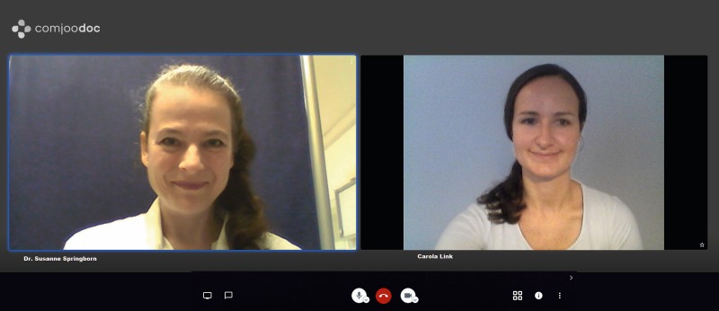 Auch Senioren zeigten trotz anfänglicher Zweifel Interesse an der ungewohnten Behandlungstechnik. Mit weißem Kittel und professionellem Hintergrund wurde die Kollegin sofort als Ärztin identifiziert. „Das simultane Einblenden meines eigenen Bildes neben dem des Patienten gab mir ein ständiges Feedback während des Gespräches.“