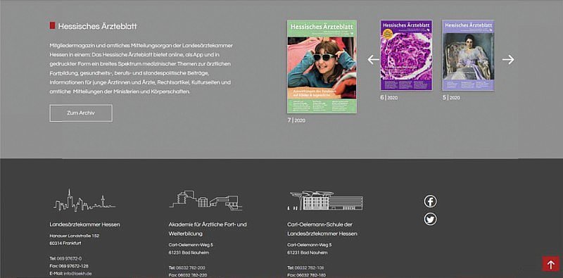 Unterhalb des Hauptinhalts befindet sich der grunderneuerte Online-Auftritt des Hessischen Ärzteblatts (HÄBL): Nunmehr im HTML-Format in die LÄKH-Website eingebunden, bietet er den Lesern viel mehr als den bisherigen Download der Monatshefte als PDF-Datei. Jeder Artikel ist nun als Webseite einzeln abrufbar, kann bei Bedarf ausgedruckt und als einzelne PDF heruntergeladen werden. Verbunden mit dem neu eingerichteten Heftarchiv der Ausgaben der vergangenen Jahre wird die Suche nach Themen, Artikeln und Autoren deutlich erleichtert.