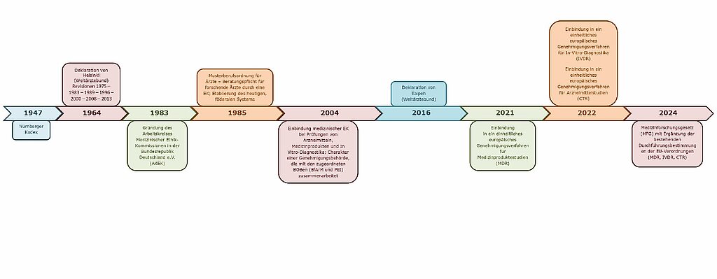 Weltweit gilt, dass ein Forschungsvorhaben am Menschen vor Studienbeginn zur Erwägung, Stellungnahme, Beratung und Zustimmung einer zuständigen Forschungs-Ethikkommission vorzulegen ist. Für die etwa 10.000 solcher Vorhaben, die in Deutschland jährlich initiiert werden, gibt es mehr als 50 nach Landesrecht gebildete Ethikkommissionen (EK) an Medizinischen Fakultäten bzw. Universitäten, Landesärztekammern und als Einrichtungen der Bundesländer. Seit ihrer Einführung in den 1980er-Jahren (s. Abb.) ist es ihre Aufgabe, Forschungsprojekte der epidemiologischen, klinischen und Versorgungsforschung an und mit Menschen berufsethisch wie berufsrechtlich zu beraten und zu beurteilen. Grundlage ist hier zunächst die Deklaration von Helsinki (DoH) und § 15 der Berufsordnung für die in Deutschland tätigen Ärztinnen und Ärzte. Insbesondere hat aber die seit 2004 bestehende Einbindung medizinischer EK in den inzwischen europäisch geregelten Gesetzesrahmen bei Prüfungen von Arzneimitteln, Medizinprodukten und In Vitro-Diagnostika ihre Aufgaben erweitert; sie haben in diesen Feldern den Charakter einer Genehmigungsbehörde bekommen, die mit den zugeordneten Bundesoberbehörden (BOB/BfArM und PEI) zusammenarbeitet. Durch ihre nunmehr fast 20-jährige Tätigkeit bei der Bewertung von Arzneimittelprüfungen haben die Ethikkommissionen eine sehr große Expertise sammeln können, so auch bei komplexen Studienvorhaben.