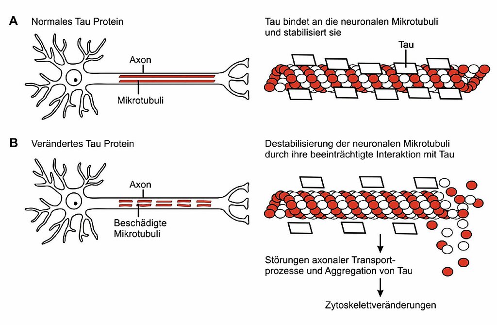 Hierbei handelt es sich um in den Nervenzellen lokalisierte Proteinablagerungen, die sich mit Versilberungstechniken (Gallyas-Versilberungen) und immunzytochemischen Methoden im Gehirn von Patienten sichtbar machen lassen. Heute wissen wir, dass die Veränderungen auf ein abnormal phoshoryliertes Tau-Protein zurückzuführen sind. Normales Tau interagiert mit neuronalen Mikrotubuli, die eine entscheidende Rolle beim axonalen Transport spielen (Abb. 2). Durch die abnormale Phoshorylierung des Tau-Proteins kommt es zu einer Destabilisierung der neuronalen Mikrotubuli, einer Störung des axonalen Transports und einer Aggregation von Tau-Protein, die sich als neuronale Fibrillen, neuronal tangles und Neuropilfäden manifestieren.