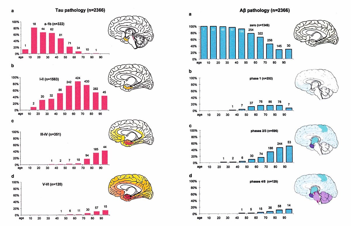 Mit ihren systematischen Studien zur Tau-Pathologie konnten Heiko und Eva Braak an der Dr. Senckenbergischen Anatomie in Frankfurt bahnbrechende Erkenntnisse gewinnen und legten 1991 auf Grund der Verteilung der pathologischen Tau-Aggregate in der Rinde des Endhirn (Telencephalon) eine Stadieneinteilung der Erkrankung vor (Braak-Stadien I-VI) [12, 13] (Abb. 3, nur online), die von der Weltgesundheitsorganisation (WHO) übernommen wurde.