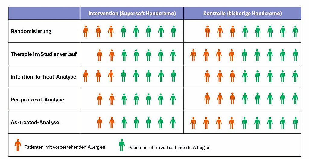 - Herr Schmidt (Interventionsgruppe) weicht von der vorgesehenen Intervention ab, weil diese unzureichend wirksam ist. Wahrscheinlich hat Herr Schmidt eine besonders trockene Haut, vielleicht sogar eine atopische Dermatitis. Die Nichtberücksichtigung von Studienteilnehmern wie Herrn Schmidt würde zu einer Überschätzung der Wirksamkeit von Supersoft führen, da in der Interventionsgruppe der Anteil von Teilnehmern mit einem hohen Risiko für Handekzeme sinken würde.