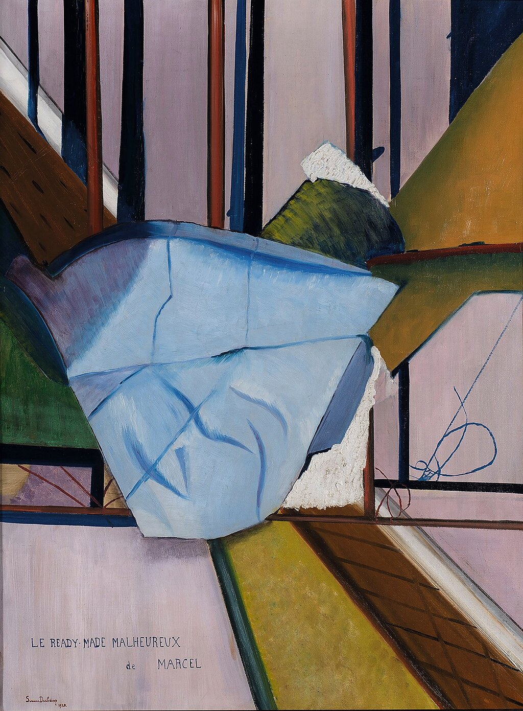 Auch „Le Readymade Malheureux de Marcel (Das unglückliche Readymade von Marcel)“ verweist auf ihr Umfeld, ohne es zu imitieren. Das 81 × 60 cm große Ölbild überträgt das von Marcel Duchamp initiierte Experiment – ein Geometriebuch, dem Wetter ausgesetzt – in malerische Form. Statt die Geste des Zufalls zu wiederholen, registriert Suzanne Duchamp deren Ergebnis und macht es zum Motiv. So reflektiert sie das Readymade, ohne dessen Konzept zu übernehmen.