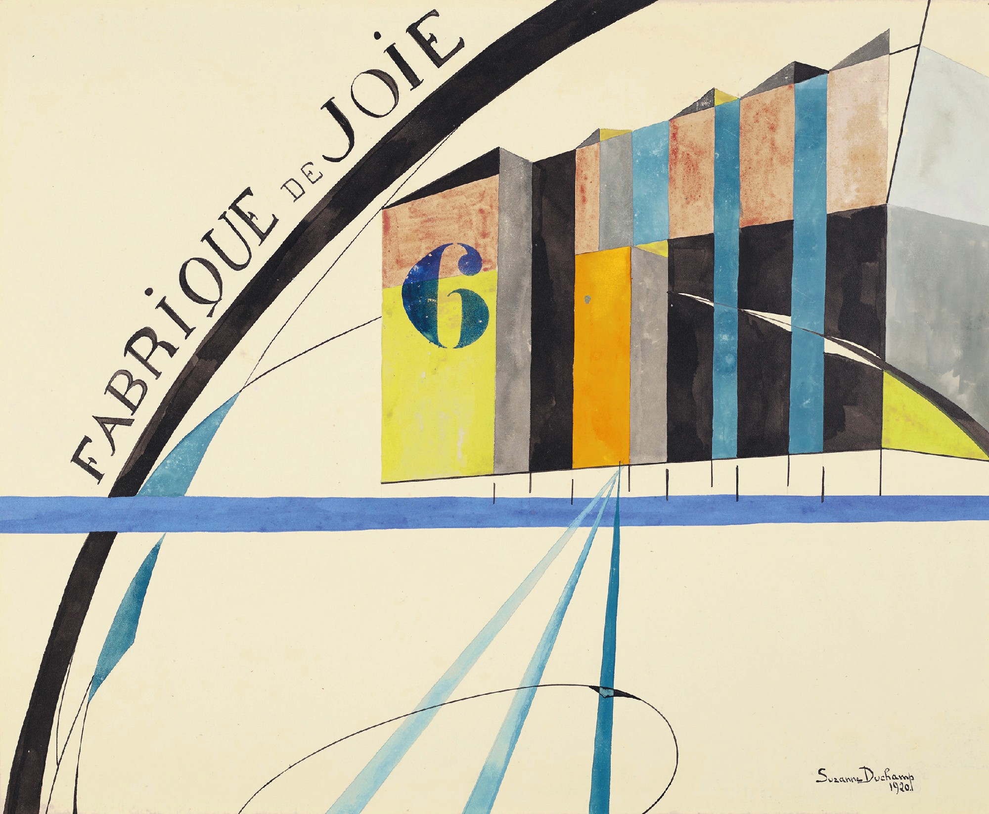Besonders deutlich wird dies in zwei Werken von 1920. „Fabrique de Joie (Fabrik der Freude)“ kombiniert Gouache, Aquarell, Bleistift und Tinte zu einer offenen, flächigen Struktur aus Linien, Formeln und Textfragmenten. Die Arbeit greift die Sprache technischer Zeichnung auf, ohne sich funktional lesen zu lassen, und zeigt Duchamps Interesse an der Gleichrangigkeit von Schrift, Bild und Zeichen.