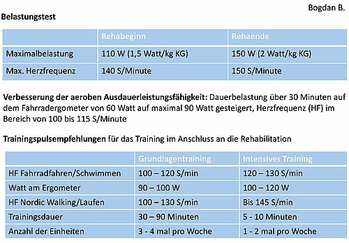 Und wie geht es dem Staplerfahrer Bogdan B. heute? Er hat nach drei Wochen intensiver Reha eine ergometrische Ausdauerleistungsfähigkeit von 90 Watt erreicht. Das Rauchen hat er aufgegeben. Nach einer ärztlich verordneten vierwöchigen Pause durfte er wieder in seinen gerne ausgeübten Beruf zurückkehren. Er hat so viel Vertrauen in seinen Körper zurückgewonnen, dass er sich ein Abonnement im speziell auf seine Bedürfnisse konzipierten Fitnessstudio leistet, um dauerhaft von den positiven Effekten einer kontrollierten Bewegung zu profitieren.