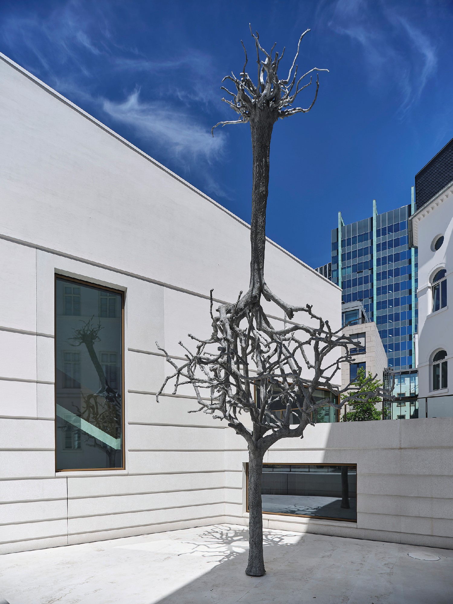 Zu den herausragenden Werken gehören Gemälde von Moritz Daniel Oppenheim, Henri Matisse und Ludwig Meidner sowie zeremonielle Objekte aus der Werkstatt von Felix Horovitz. Die Ausstellung erstreckt sich über drei Etagen und beleuchtet zentrale Aspekte jüdischen Lebens in Frankfurt. Der Rundgang beginnt im lichtdurchfluteten Neubau, wo durch das Fenster das Kunstwerk „untitled“ von Ariel Schlesinger sofort ins Auge fällt: Zwei Bäume, von denen einer auf dem anderen ruht – ein Symbol für Verwurzelung und die Brücke zwischen Vergangenheit und Zukunft.