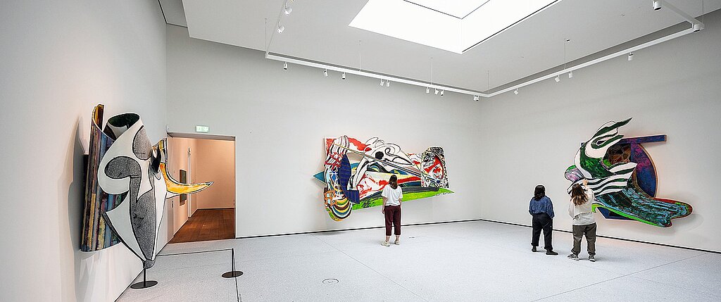 Zum Staunen verführt auch der dem amerikanischen Künstler Frank Stella und seiner Serie „Moby Dick“ gewidmte Ausstellungsraum. Jedes Werk ist nach einem der 135 Kapitel des gleichnamigen Romans von Hermann Melville aus dem Jahr 1851 benannt. In den drei vielfarbigen Wandreliefs aus der Sammlung Reinhard Ernst, die in dem Museum zu sehen sind, verschränkt Stella Literatur und bildende Kunst miteinander.