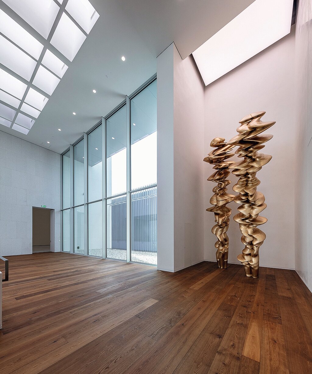 Schon im Foyer sind beeindruckende zeitgenössische Kunstwerke zu sehen. Die großformatige, eigens für das Museum entstandene Glasarbeit von Katharina Grosse etwa, hinter der sich ein Kreativraum für Kinder und Jugendliche – das Farblabor – befindet, die dreiteilige Stahlskulptur „Buscando la luz III“ von Eduardo Chillida im nicht begehbaren, im Stil eines japanischen Gartens angelegten Innenhof und eine Glasinstallation von Karl-Martin Hartmann.