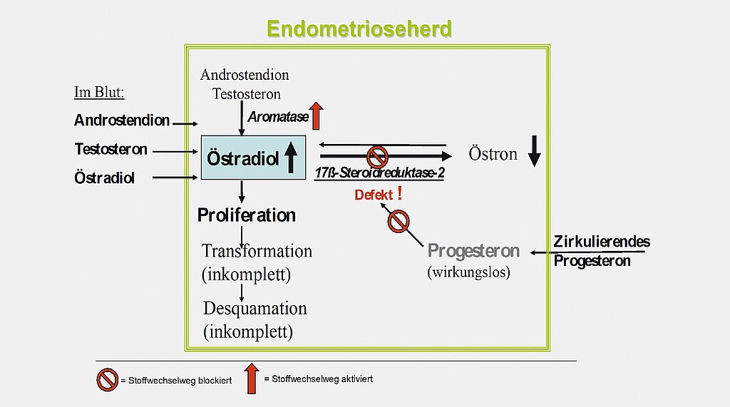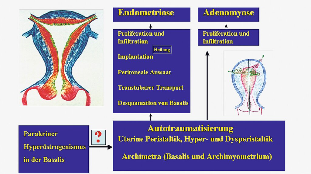 - Östrogener circulus vitiosus: Mikrotraumata oder mechanische Traumata des Endometrium führen zu Reparaturprozessen, die die Expression der p450-Aromatase verstärken. So kommt es zu einem Anstieg des Östradiol-17ß im Gewebe (basaler Hyperöstrogenismus), was zu einer Hyperperistalsis uteri führt, die die Mikrotraumatisierung verstärken kann. Die Hyperperistaltik führt a) primär zu Invasion der basalen Endometriumschichten über die stromalen Komponenten in das Myometrium, und b) zu einer Abschilferung von basalem Endometrium mit Stammzellen, die transtubar in das kleine Becken gelangen und dort implantieren, invadieren und proliferieren. Basale Endometriumstammzellen spielen eine essenzielle Rolle bei der Regeneration des Endometriums und können auch extrauterin aktiviert werden. Begleitet werden diese Prozesse von der östrogenbedingten Induktion der Cyclooxygenase-2, welche die Prostaglandinsynthese aktiviert. Prostaglandine sind Schmerzstoffe, die aber auch Zelleigenschaften, wie Migration und Invasion verstärken und zur Induktion der p450-Aromatase führen, was einen Circulus vitiosus bewirkt.