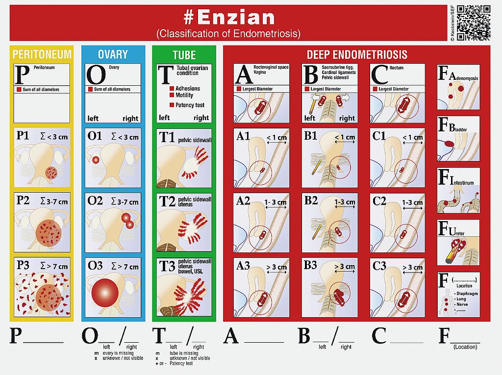 Bei Verdacht auf eine pelvine Endometriose sollte auch eine beidseitige Nierensonographie vorgenommen werden, da durch eine extrinsische oder intrinsische Ureterendometriose relativ häufig eine meist symptomarme Hydronephrose entstehen kann, die im schlimmsten Fall zu einer stummen Niere führt. Dieses Vorgehen ermöglicht bereits präoperativ eine Klassifizierung der Endometriose nach dem #Enzian-Schema (Abb. 5) [33], welches ein gutes Instrument für die einheitliche Beschreibung der Endometriose darstellt und außerdem abschätzen hilft, wie ausgedehnt eine operative Therapie sein könnte und mit welchen Komplikationen gerechnet werden sollte.