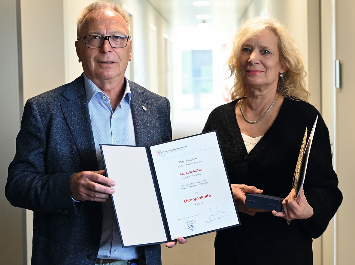 Für ihr herausragendes Engagement und ihre jahrzehntelange Arbeit in der Gesundheitskommunikation wurde Katja Möhrle, Leiterin der Stabsstelle Kommunikation, mit der Ehrenplakette der Landesärztekammer Hessen ausgezeichnet.