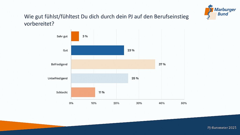 Die finanzielle Lage vieler PJ-Studierender bleibt angespannt. Ein Großteil der Befragten ist neben der Aufwandsentschädigung vor allem auf familiäre Unterstützung angewiesen, um den Lebensunterhalt zu bestreiten. Die Einschätzung der eigenen Vorbereitung auf den ärztlichen Berufsalltag fällt insgesamt verhalten aus. Ein Drittel fühlt sich durch das Praktische Jahr unbefriedigend (25 %) oder sogar schlecht (11 %) auf den Berufseinstieg vorbereitet, 37 % bewerten die Vorbereitung als befriedigend, 23 % als gut und 3 % als sehr gut.