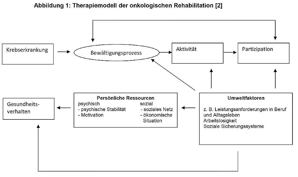 Er beinhaltet die Entwicklung von Bewältigungsstrategien, aber auch konkrete therapeutische Verfahren. Dafür sind psychische sowie physische Ressourcen des Patienten erforderlich. Aber auch das soziale Umfeld des Betroffenen ist gefordert. Darüber hinaus spielen bei der individuellen Entwicklung solcher Bewältigungsprozesse und Therapien weitere Faktoren eine wichtige Rolle. Insbesondere die Leistungsanforderungen im Berufs- und Alltagsleben, die Lebensumstände und Bedingungen am Arbeitsplatz, sowie die Angebote von sozialen Sicherungssystemen sind hier zu nennen. Mithilfe der Rehabilitation können die Aktivitäten des Patienten gesteigert werden, sodass es zu einer verbesserten Partizipation bzw. Teilhabe am Sozial- und ggf. Erwerbsleben kommt (Abb. 1). Bei der Rehabilitation handelt es sich um eine multimodale prozessorientierte Therapie, die unter Einschluss verschiedenster Fachdisziplinen durchgeführt wird [11–14].