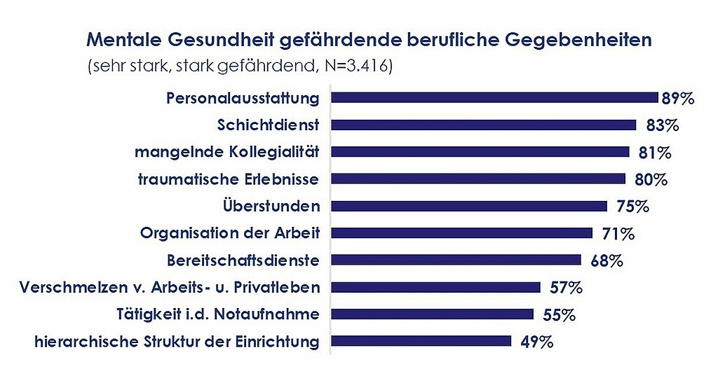 Wie in der Abbildung 2 ersichtlich, wurden bei den vorgegebenen Antworten in erster Linie Personalausstattung (89 %, sehr stark oder stark belastend), Schichtdienst (83 %) oder traumatische Erlebnisse (80 %) angegeben.