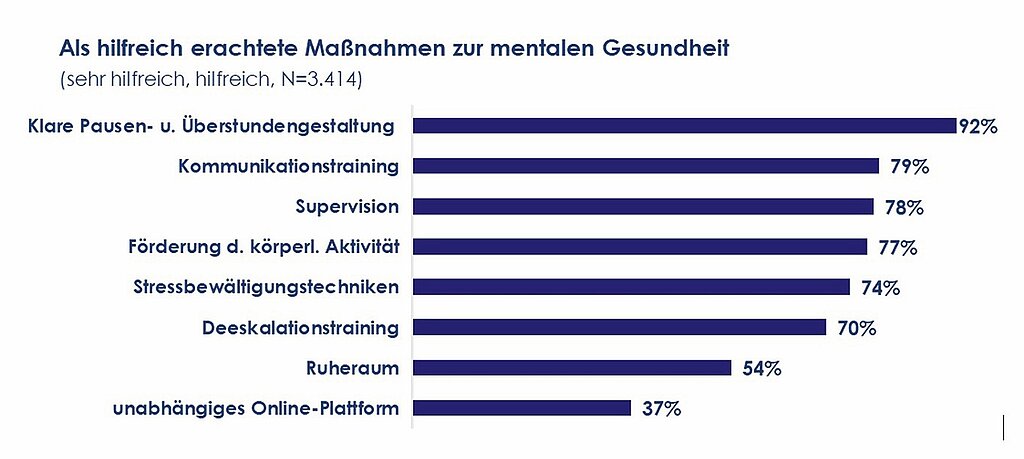 Bei den vorgegebenen Antworten (siehe Abb. 3) wurden folgende Maßnahmen als hilfreich oder sehr hilfreich erachtet: Klare Pausen- und Überstundengestaltung (92 %), Kommunikationstraining (79 %) oder Supervision (78 %). Als am wenigsten hilfreich wurden der Ruheraum (54 %) sowie eine unabhängige Online-Plattform mit Maßnahmen zur mentalen Gesundheit (37 %) angegeben.