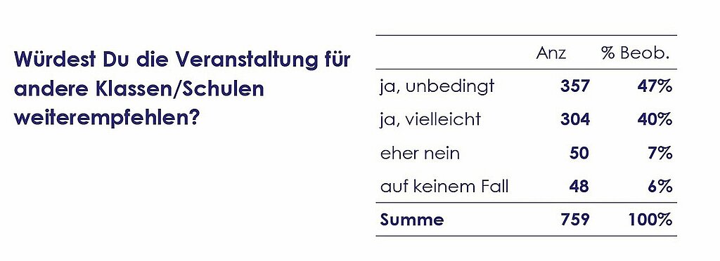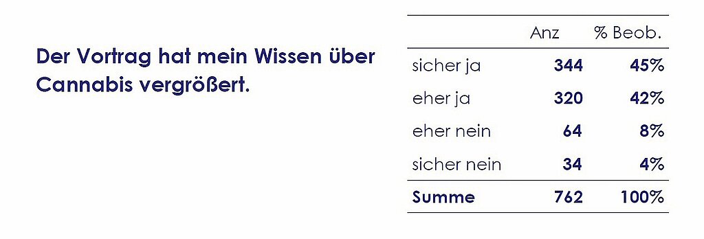 Besonders positiv schneidet das Projekt beim subjektiv erlebten Wissenszuwachs ab: 87 % der Befragten gaben an, dass die Aktion ihr Wissen sicher beziehungsweise eher vergrößert habe. Ein ebenso großer Anteil würde das Projekt tendenziell anderen Klassen oder Schulen weiterempfehlen. Insgesamt 59 % stimmten der Aussage zu bzw. eher zu, dass ihnen einige Gefahren von Cannabis zuvor nicht bewusst waren.